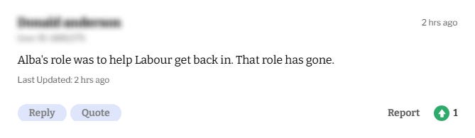 Trying to figure out WTF is going on I see this article in the Sunday National has prompted some conspiracist drivel from what we must suspect is an SNP loyalist (see below). The reality is that Alba Party has no role. Alba Party has never had a role in Scotland's politics. That is why it has failed to make any significant impact. People just don't know what purpose it serves. They don't understand what it's for. Alba Party loyalists imagine their party to be a more radical pro-independence alternative to the SNP. But that is entirely imaginary. The party's supporters talk up Alba with all manner of claims about what it stands for and what it will do. But they are battling against a leadership that has signally failed to establish a distinctive identity or agenda. The potential was there when the party was launched into the 2021 Holyrood election campaign by Alex Salmond in March 2021, just weeks before the vote. That was a mistake. But the far bigger mistake was the leadership's failure to differentiate Alba Party from the SNP in a way that would allow it to be perceived as an alternative rather than a rival. It should have been obvious that the initial wave of people joining Alba Party would be almost entirely disaffected ex-SNP members, many of whom were understandably resentful about the way their party had been hijacked by the Sturgeon clique and bitter about the direction in which the party had been taken since 2014. The leadership seemed not to realise the implications of this, however. They allowed the party's public image to be formed by the angry refugees from the Sturgeon Nepotism Party. It was not an image that was ever going to appeal to voters. The Alba Party leadership could - and should - have avoided this by giving the membership something to be for instead of leaving them with only something to be against. Once the tribalism set in, there was no going back. There is no way that destructive genie is going back in the bottle absent some seriously effective management There were opportunities for an intervention which might have turned things around for Alba Party. Ash Regan's defection from the SNP at Holyrood as well as Neale Hanvie and Kenny MacAskill at Westminster could have been 'new brooms' that swept away Alba's image as the anti-SNP image by refocusing its agenda on the constitutional issue and presenting some innovative thinking on the 'route to independence'. Innovative thinking such as had come to be regarded as heresy in Sturgeon's SNP. One of the main reasons so many members quit the party she had made a vehicle for her personal ambition rather than the vehicle for independence. It didn't happen. Neither did anything change with Alex Salmond's untimely death and the ensuing leadership contest. Neither MacAskill nor Regan offered anything new. Both are capable politicians, each in their own way. Regan's ability to raise her own profile is reminiscent of Sturgeon's skill in this area. MacAskill is a man of great integrity but a bit staid and stuffy, He is respected rather than liked If the former had better policy advisors and the latter better personal imaging advisors, either could have been a stand-out leader. As it turned out, neither is. It all comes back to the failure to develop a distinctive identity and radical position on the constitutional issue. They would still have set Alba against the SNP. But the rivalry would have been based on something more meaningful and positive than a mutual resentment that in many cases has escalated to vitriolic hatred. Alba Party now has another opportunity to become the 'party of independence' that the SNP long since ceased to be. The 2026 Scottish Parliament election has the potential to be used as a democratic event that gets Scotland's cause rolling again. As John Curtice's analysis indicates, Alba has nothing to lose by adopting a more assertive and even aggressive approach to the constitutional issue which contrasts starkly with the hyper-cautious conservatism of Swinney's SNP. This would have three effects, all of which would improve Alba's electoral prospects in 2026. Were Alba Party to adopt the Manifesto for Independence, this would make it markedly different from the SNP. It would give the party that distinctive identity and agenda it so sadly lacks. In taking the lead on the constitutional issue, all that stuff about 'holding the SNP's feet to the fire' would become more than empty sloganeering. Finally, adopting the Manifesto for Independence would make Alba Party a disruptor to rival Reform UK - but in a positive way. You're currently a free subscriber to Peter A Bell. For the full experience, upgrade your subscription. |