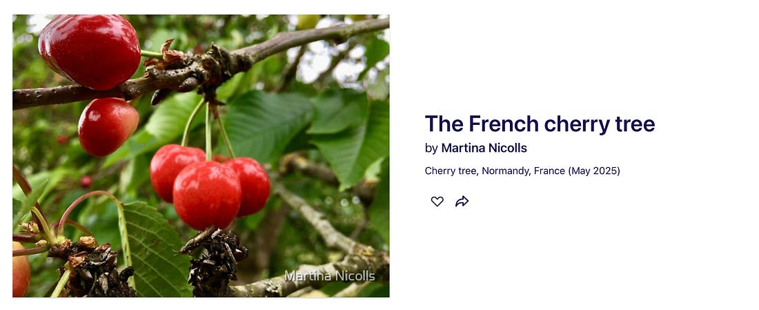 France has over 100 varieties of cherries. Vaucluse and Rhône produce the most cherries in France. In French markets, you’ll find: Burlat (an early, plump, sweet variety) Bigarreau (a firm and juicy variety) Montmorency (cherries used in clafoutis and kirsch). The cherry tree photographs are from a property in Normandy where an aunt lives. It is an old hybrid tree, likely self-seeded and wildish, but every year it performs with loyalty. No fertilizers. No fuss. Just sun, rain, and a little patience. I visited Normandy this week. The cherry tree reminded me of a 2017 song by Riccardo Tronca, from his A Couple of Cherries album called “Cherries:” “Cherries shine red in the light of the sun Cherries are cherries and you are my love.” His lyrics capture something that fruit trees often embody — longing and love. There’s sensuality in cherries, yes, but also nostalgia. A cherry tree is never just a cherry tree. It is childhood and youth, a kiss under its boughs, or a bowl of glistening fruit shared with someone who remembers when you were twelve. For all of time, most people love cherries and their symbols. Cherries are ancient — cultivated for over 4,000 years — but their emotional appeal has more to do with feeling than farming. In Japan, cherry blossoms symbolize the fleeting beauty of life. In the West, cherries are associated with sweetness, desire, temptation, and youth. But it's also a tree of generosity with short-lived fruit. People eat cherries in season, living and eating in the moment. Tronca’s lyrics echo that thought: “This is a song for the lovers to come Photographer: Martina Nicolls Can’t see the whole article? Want to view the original article? Want to view more articles? Go to Martina’s Substack: The Stories in You and Me More Paris articles are in my Paris website The Paris Residences of James Joyce Rainy Day Healing - gaining ground in life You're currently a free subscriber to The Stories in You and Me . For the full experience, upgrade your subscription. |