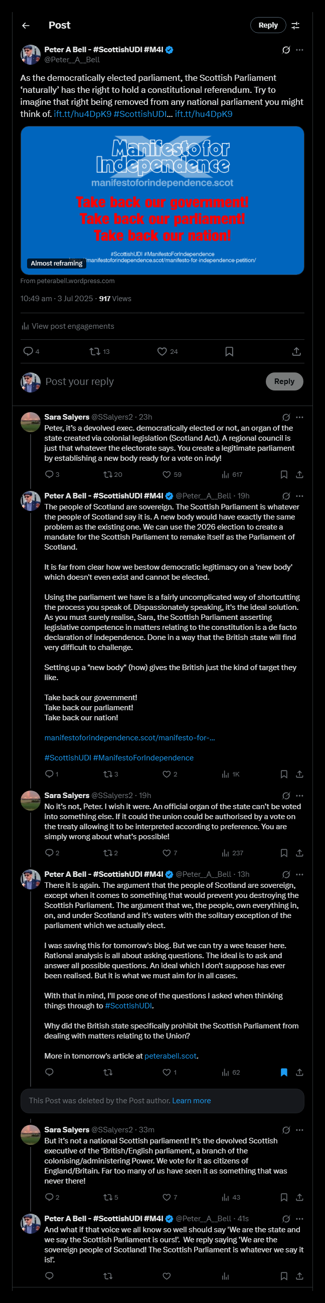 Trying to figure out WTF is going on As I said to someone on X just a short time ago, the way #ScottishUDI and the Salvo/Liberation UN initiative fit together is positively elegant. The former provides the essential internal (to Scotland) political and parliamentary process which is perfectly complemented by the latter. Meanwhile, should the Manifesto for Independence achieve significant support, it will create a very visible demonstration of the demand for independence. At least as importantly, it will demonstrate that we are putting in the effort ourselves in a way that can directly exploit UN recognition of Scotland's status as annexed territory. The victim of colonisation thinly veiled by a fake political union. Given that the two efforts work so well together, it is unfortunate that I find myself in such strong disagreement with Sara Salyers, one of the main architects of the UN initiative, on a point of considerable importance. The image below is a screenshot of a recent exchange on X which nicely illustrates the conflicting perspectives on the Scottish Parliament. [It appears that some of Sara's comments have since been removed. I make no comment other than to state that the screenshot is genuine.] It is an exchange which has been repeated almost verbatim a number of times. Neither of us is moving on this matter. I can't move because for me, the sovereignty of Scotland's people is a red line that can barely be approached, far less crossed. I cannot speak for Sara, of course, but it appears to me that she is not moving because the law is her red line. She will, I'm sure, correct me if I have got that wrong and she has some other reason for insisting that the sovereignty of the Scottish people does not extend to the parliament directly and democratically elected by Scotland's people. My position is that the Scottish Parliament is, if you like, the 'real' parliament of Scotland. It is our national parliament. It has an impeccable claim to this status by virtue of the fact that it is mandated by the people of Scotland in an entirely democratic process which ensures proportional representation. It is as Winnie Ewing said as she chaired the first meeting of the Scottish Parliament on 12 May 1999.